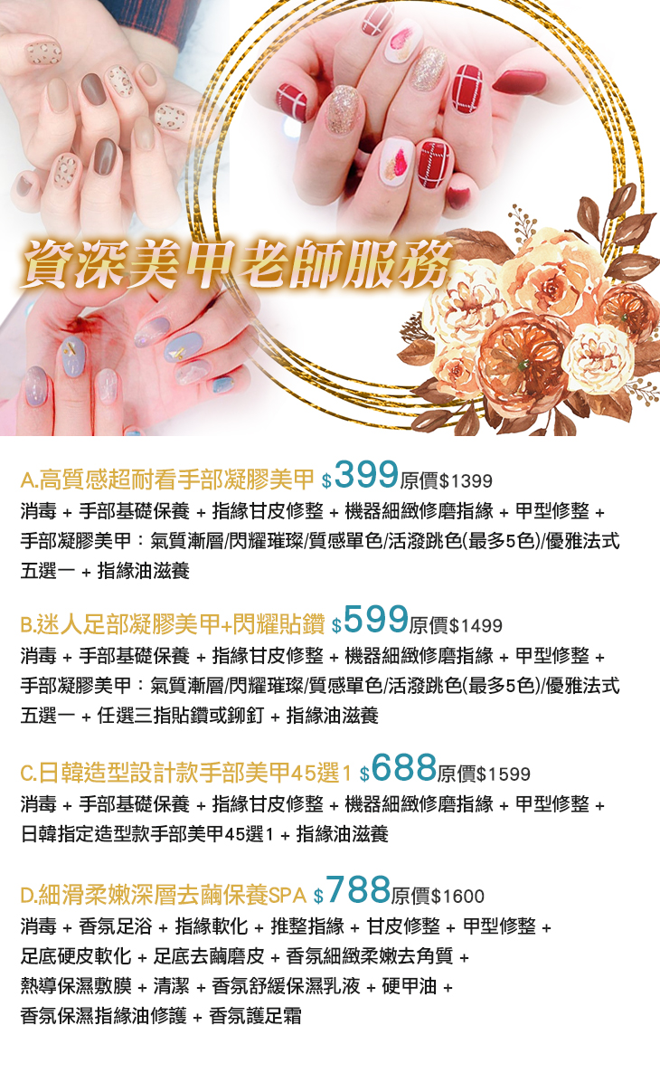 A.高質感超耐看手部凝膠美甲 / B.迷人足部凝膠美甲+閃耀貼鑽 / C.日韓造型設計款手部美甲45選1 / D.細滑柔嫩深層去繭保養SPA