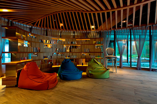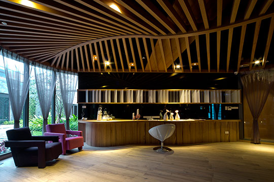用極光的幸福想像去發想,將酒店外觀以不同顏色的光柱排列,在整點時候以不同的色彩閃爍,酒店大廳的天花板,用了大量的木作與燈光隨著不同的時間變化,空間中營造出極光流竄與幻化之美。
