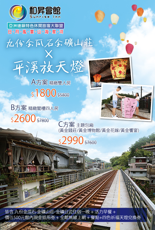 九 份 鄰近平溪,在這片山城中,讓人不禁放慢腳步、放鬆心情,盡情沉醉在這悠閒氛圍。您可以到風光明媚的平溪放天燈、十分老街逛小吃、菁桐老街感受古樸的人文風情,沿著鐵道一路玩,來趟特別的鐵道之旅。