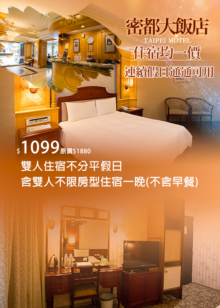 有多久沒有和另一半一起共度只有兩人的甜蜜時光?座落於台北市中心繁華商區的【密都大飯店】,以典雅精緻的古典裝潢搭配柔和的黃光設計,讓人一進到大廳,就感受到【密都大飯店】獨特的風格氣息!以熱沉、親切的專業服務,結合物超所值的平實價格,帶給您多項優質貼心的服務!本次與GOMAJI聯合推出麻吉獨享優惠,邀您來此與您的伴侶共創美好的歡樂時光!