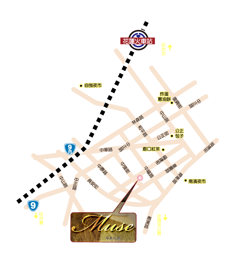 台北 →花蓮(台九省道) →過家樂福直行地下道 →右轉新生橋,直行接中央路三段 → 左轉和平路 → 右轉中正路 → 左轉中強街 → Muse 繆斯民宿(緊鄰南濱公園夜市及花蓮市區)
