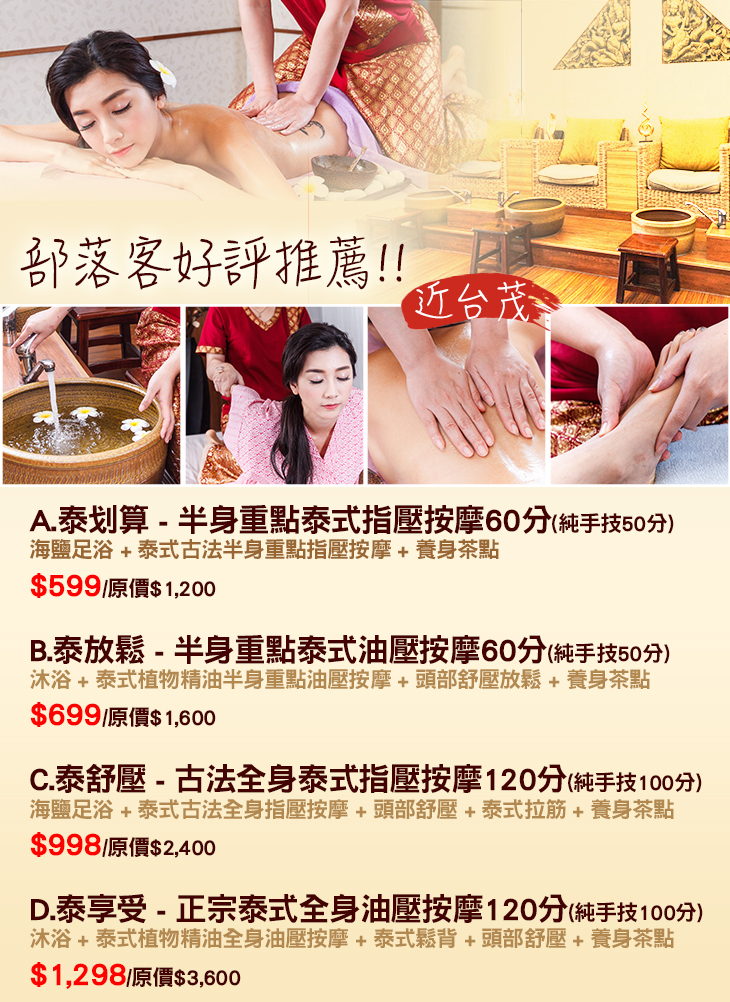 A.泰划算 - 半身重點泰式指壓按摩60分(純手技50分) / B.泰放鬆 - 半身重點泰式油壓按摩60分(純手技50分) / C.泰舒壓 - 古法全身泰式指壓按摩120分(純手技100分) / D.泰享受 - 正宗泰式全身油壓按摩120分(純手技100分)