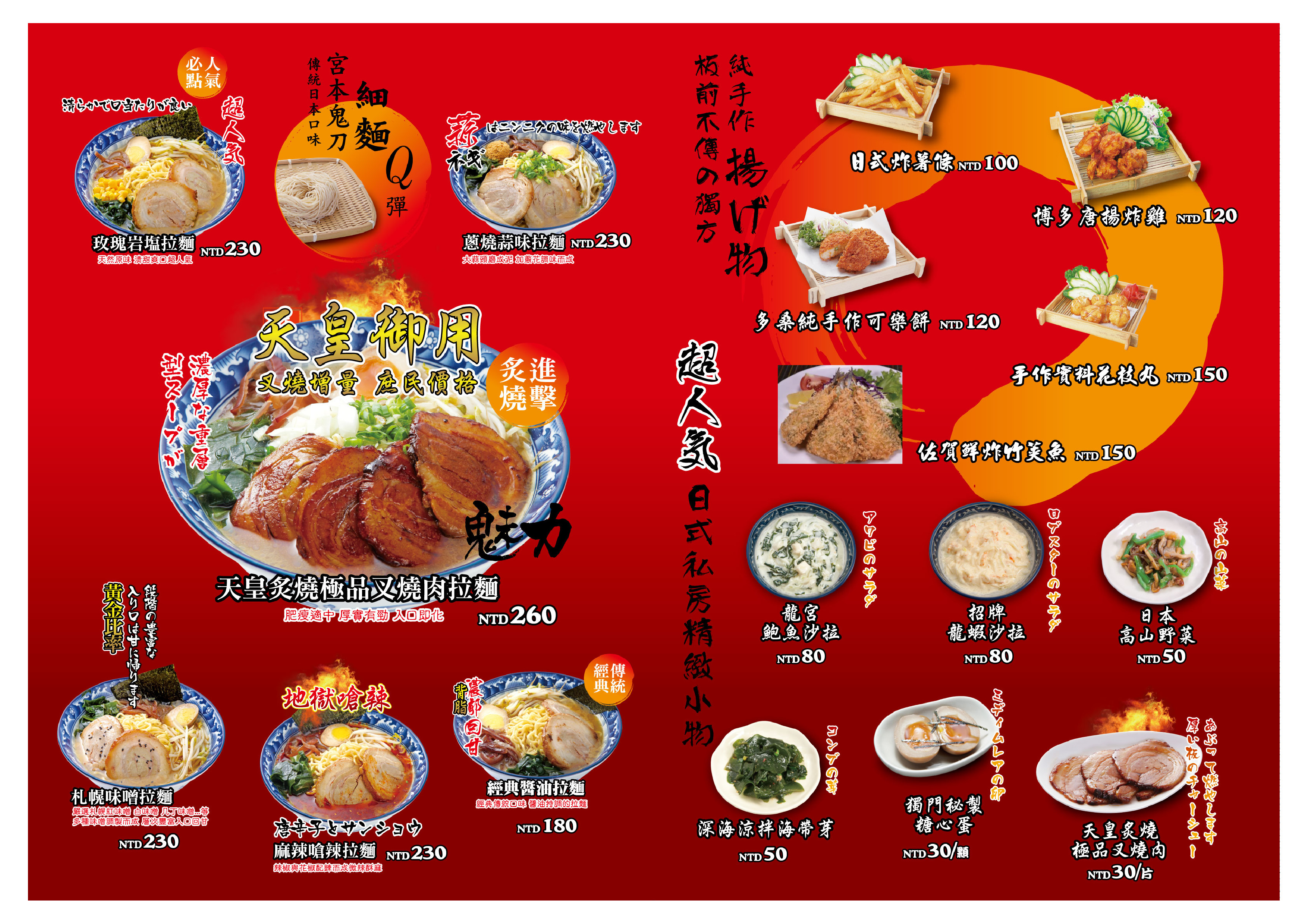 太多選擇?不知道該選什麼嗎?那就先來一碗人氣招牌、主廚推薦的「天皇炙燒極品叉燒肉拉麵」吧!保證絕對驚艷您那挑剔的味蕾唷~~~將滷得軟嫩入味的叉燒肉經過主廚嫻熟的炙燒工序烹調後,表皮微微焦香,肥瘦適中的肉質,柔嫩細緻且帶有馥郁的脂香,簡直讓人的心與胃整個融化!輕嚐一口細膩的湯頭,毫無添加任何人工香料調味,它天然的甘醇濃郁一喝就知道是來自店家的滿滿用心與堅持~讓人越喝越吃越上癮!