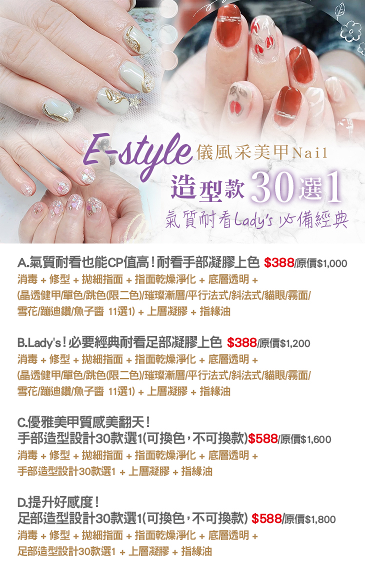 A.氣質耐看也能CP值高!耐看手部凝膠上色 / B.Lady's!必要經典耐看足部凝膠上色 / C.優雅美甲質感美翻天!手部造型設計30款選1(可換色,不可換款) / D.提升好感度!足部造型設計30款選1(可換色,不可換款)