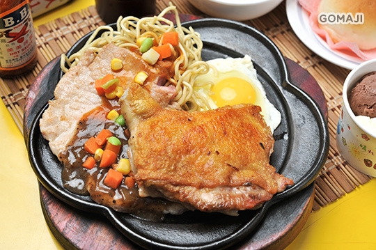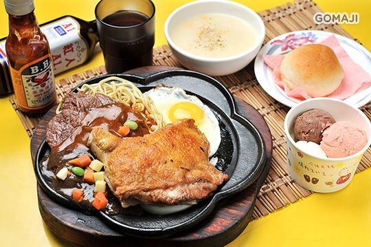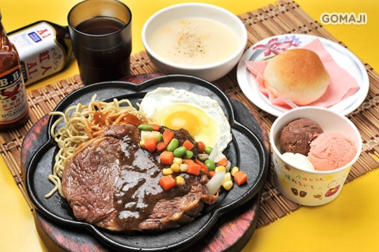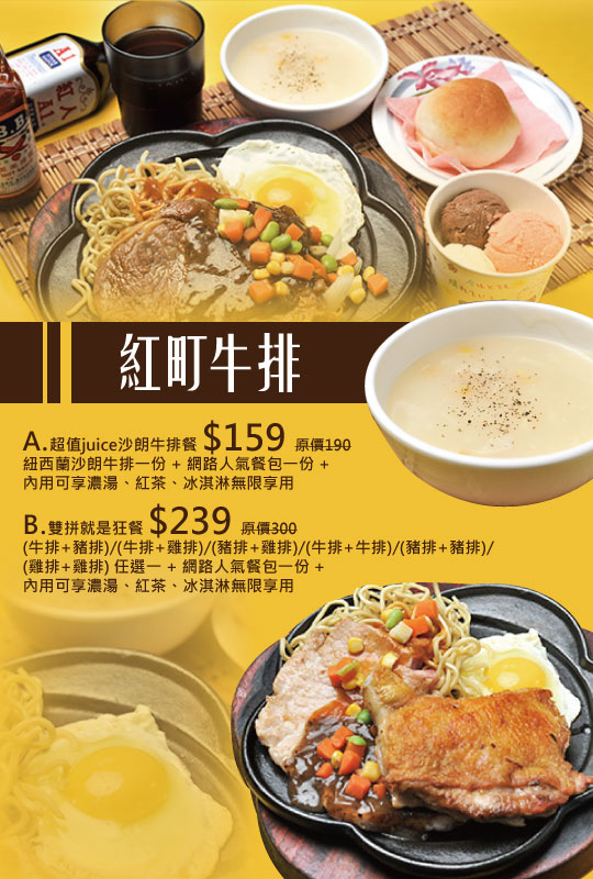 (牛排+豬排)/(牛排+雞排)/(豬排+雞排)/(牛排+牛排)/(豬排+豬排)/(雞排+雞排) 任選一 + 網路人氣餐包一份 + 內用可享濃湯、紅茶、冰淇淋無限享用