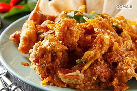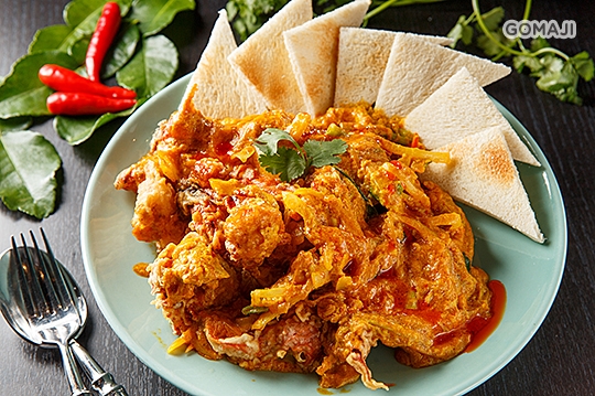香酥軟殼蟹拌入鴨蛋黃與黃咖哩,爆炒的濃郁醬汁,加上烤過的微酥脆麵包一起享用,沾上醬汁的吐司香濃誘人,令人停不住口的美味!