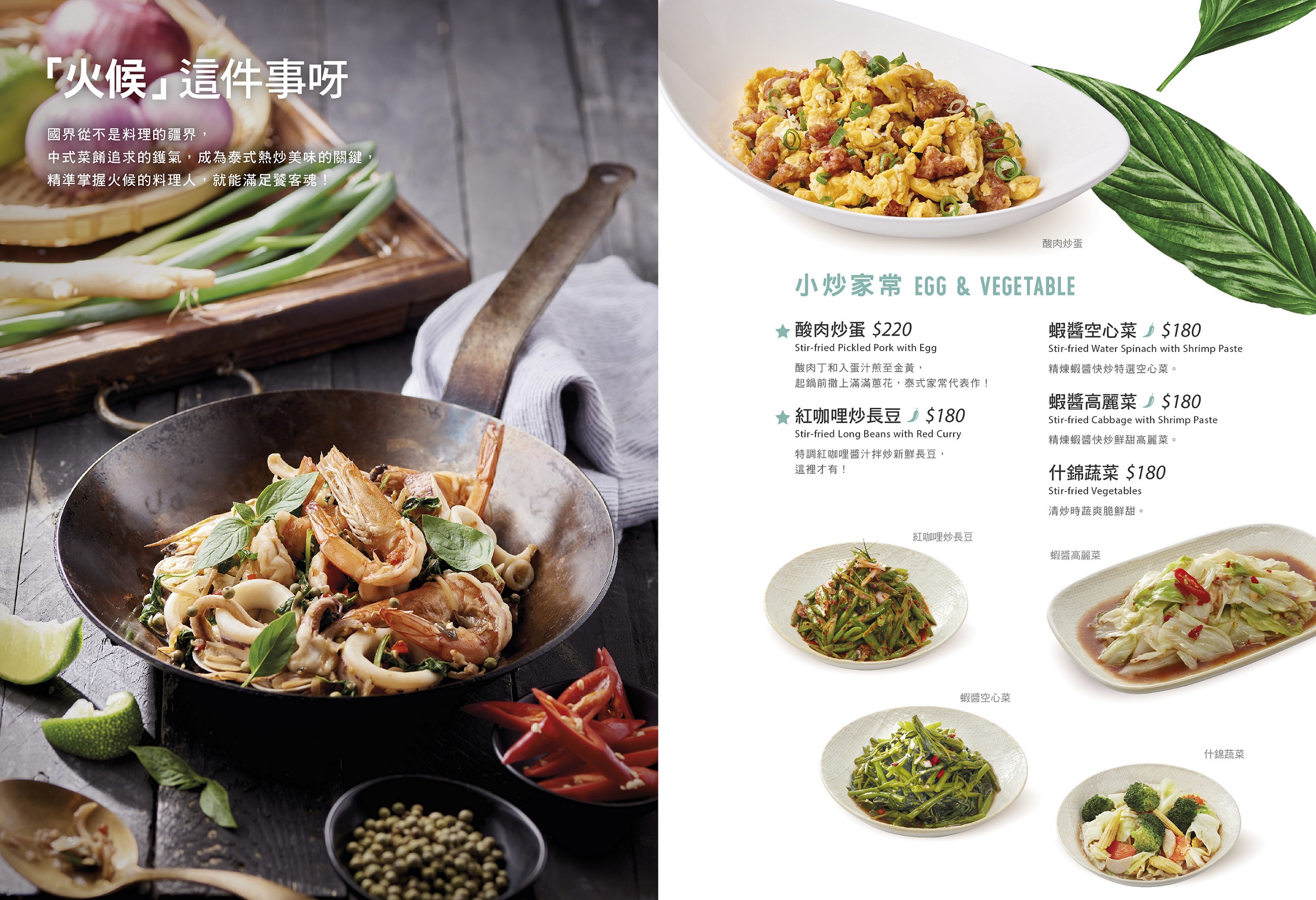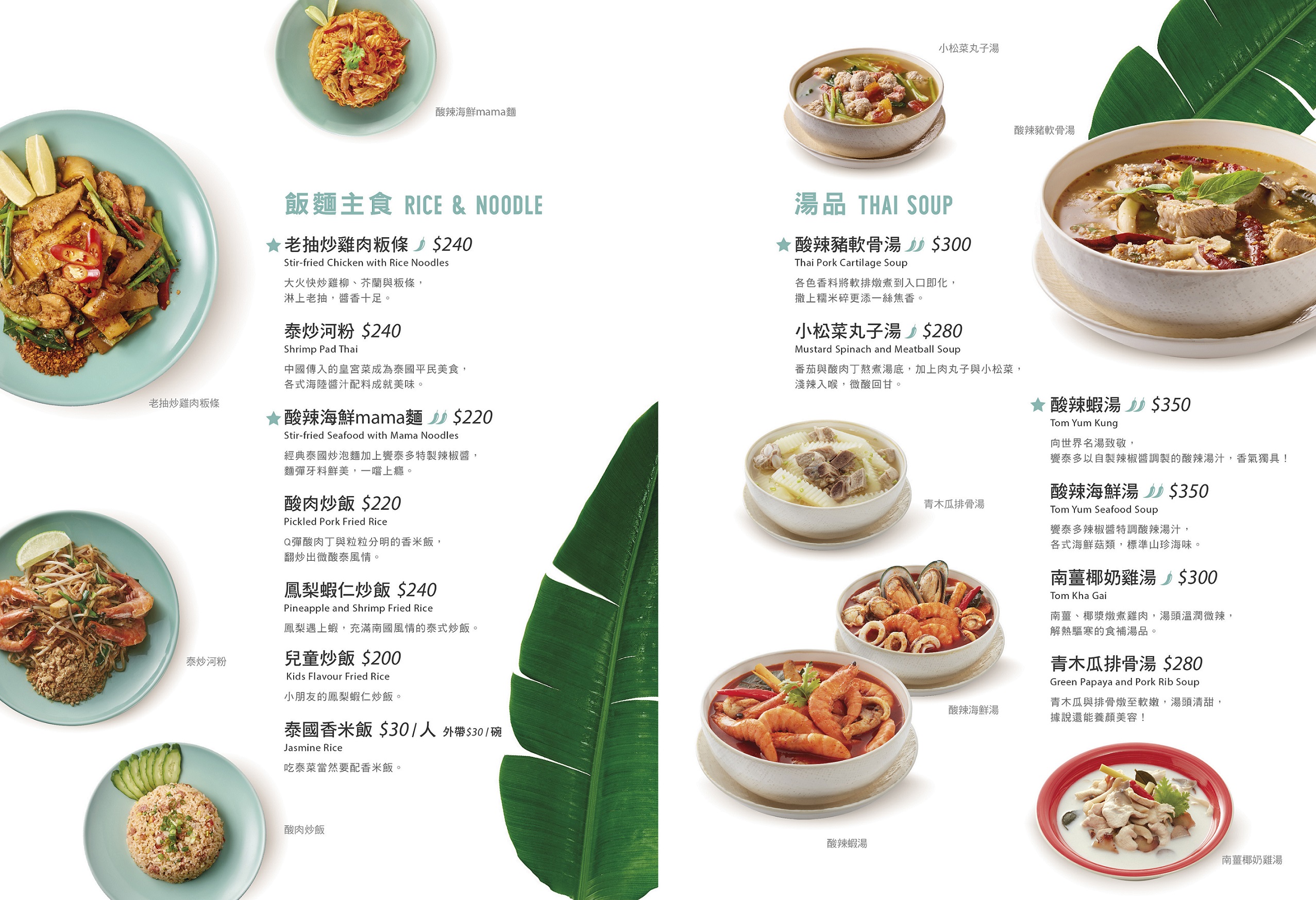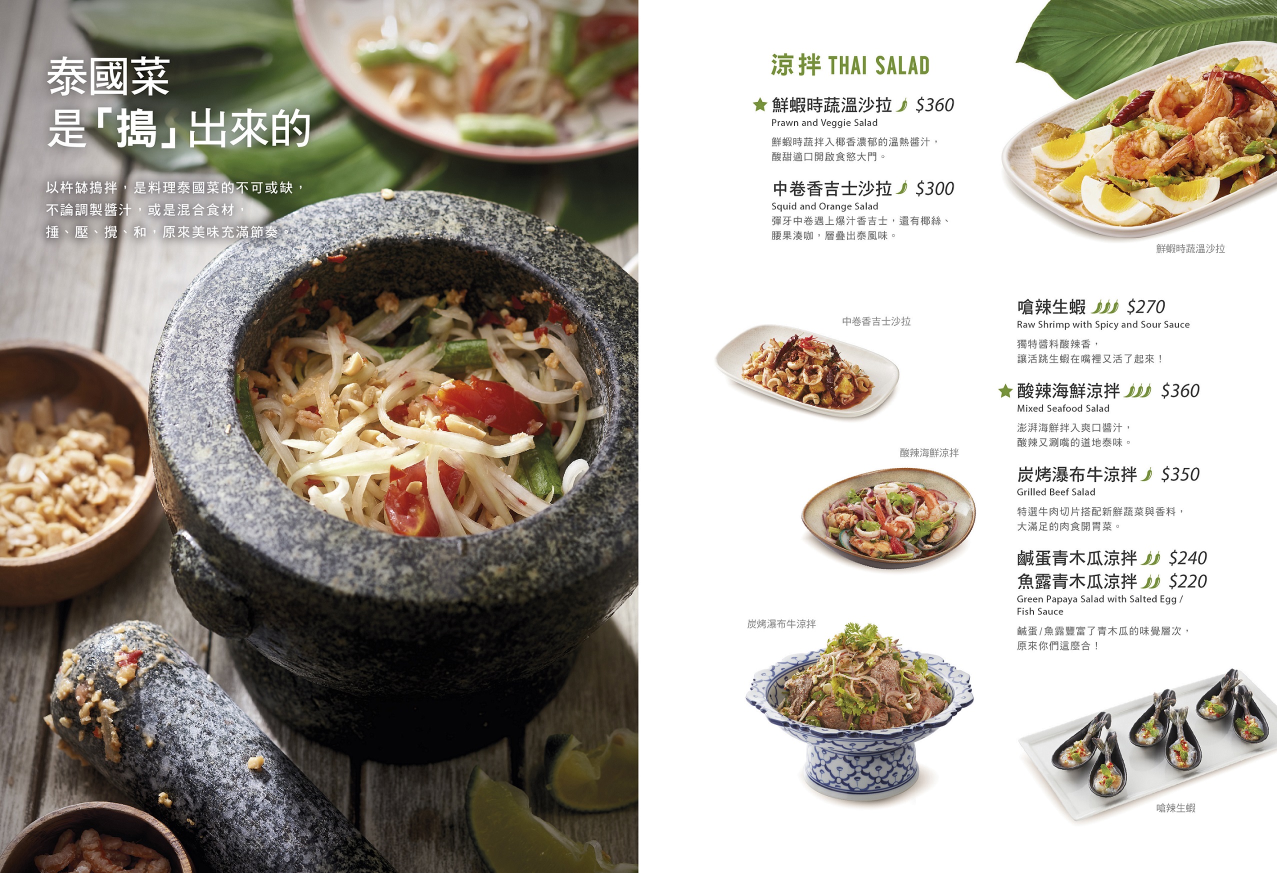 泰國菜的豐富源自於口味上有酸甜苦辣鹹香的鮮明層次感,烹調手法兼具翻炒、蒸煮、酥炸、火烤、涼拌等多樣化處理,不只讓餐桌上的料理呈現了豐盛感,更要滿足您的嗅覺與味覺!