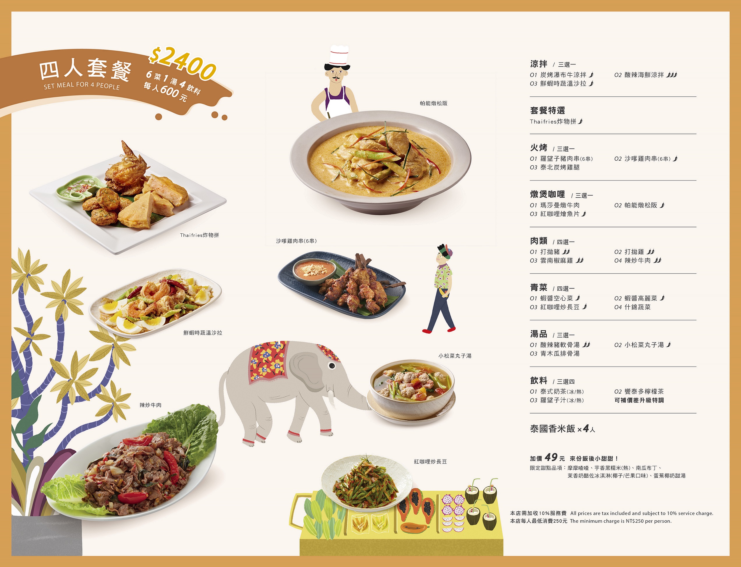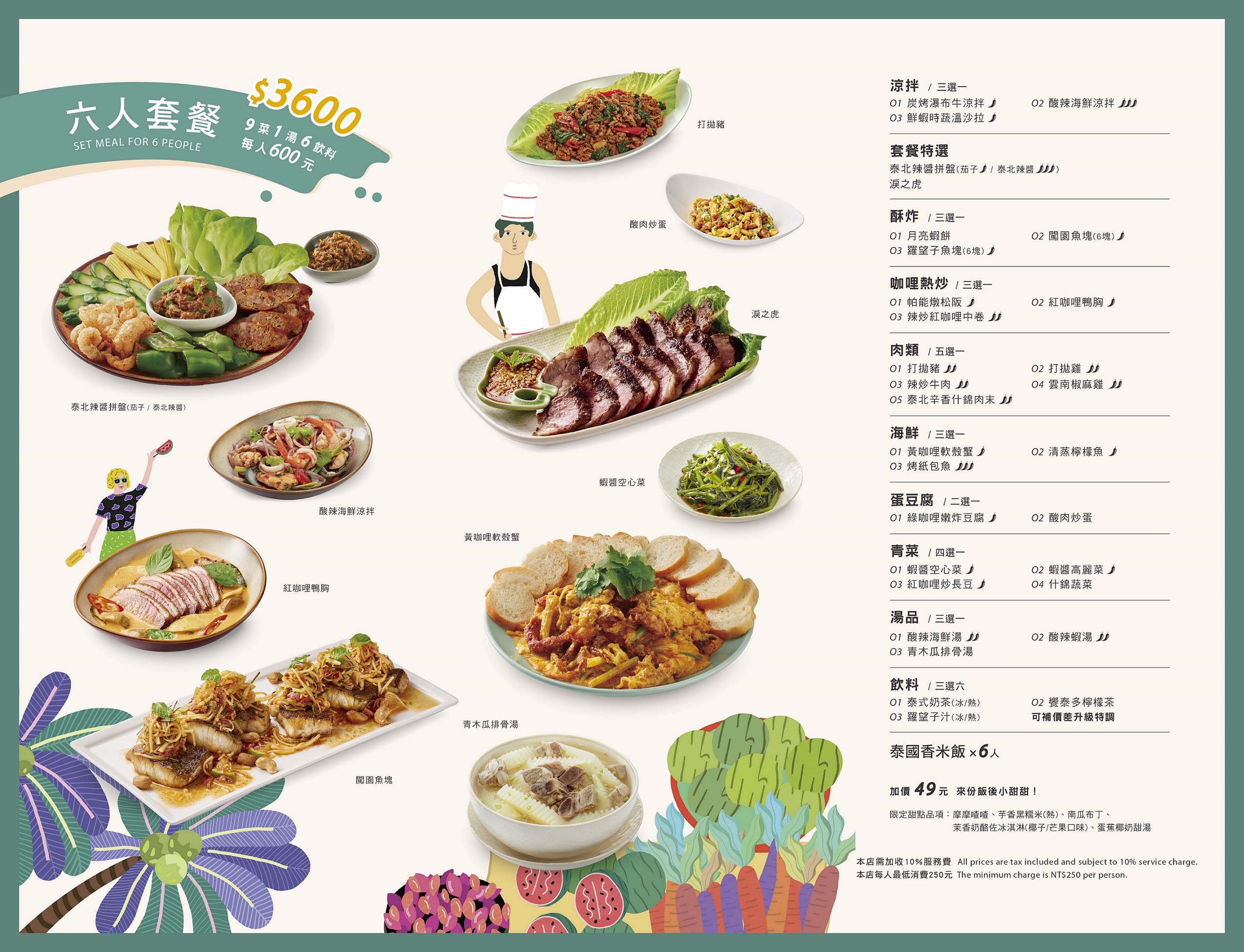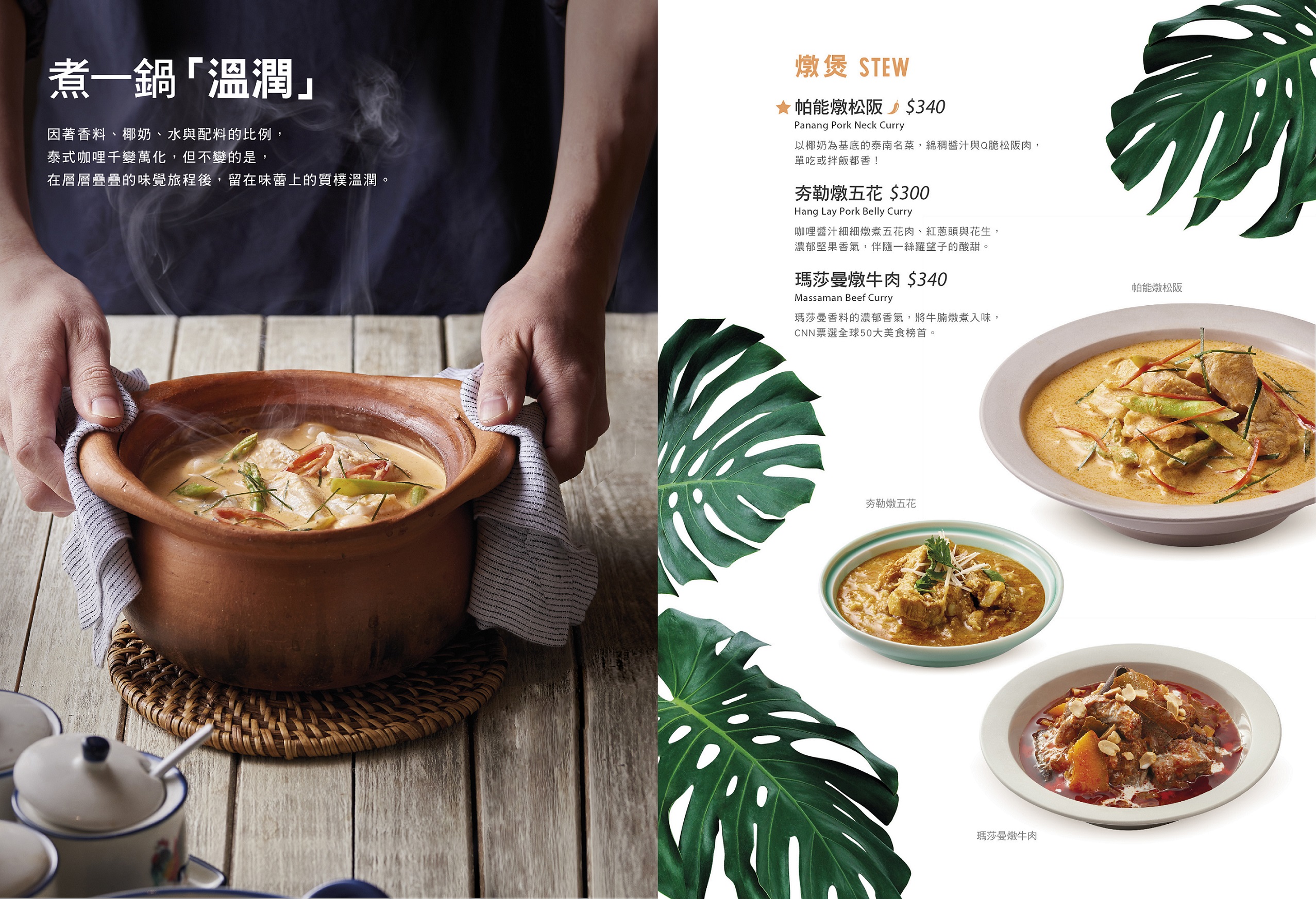 泰國菜的豐富源自於口味上有酸甜苦辣鹹香的鮮明層次感,烹調手法兼具翻炒、蒸煮、酥炸、火烤、涼拌等多樣化處理,不只讓餐桌上的料理呈現了豐盛感,更要滿足您的嗅覺與味覺!