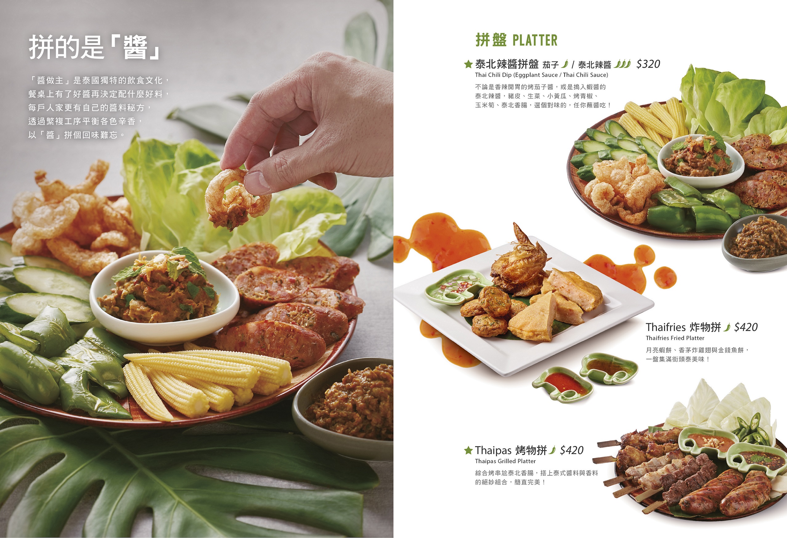 不論是香辣開胃的烤茄子醬,或是搗入蝦醬的泰北辣醬,豬皮、生菜、小黃瓜、烤青椒、玉米筍、泰北香腸,選個對味的,任你蘸醬吃!