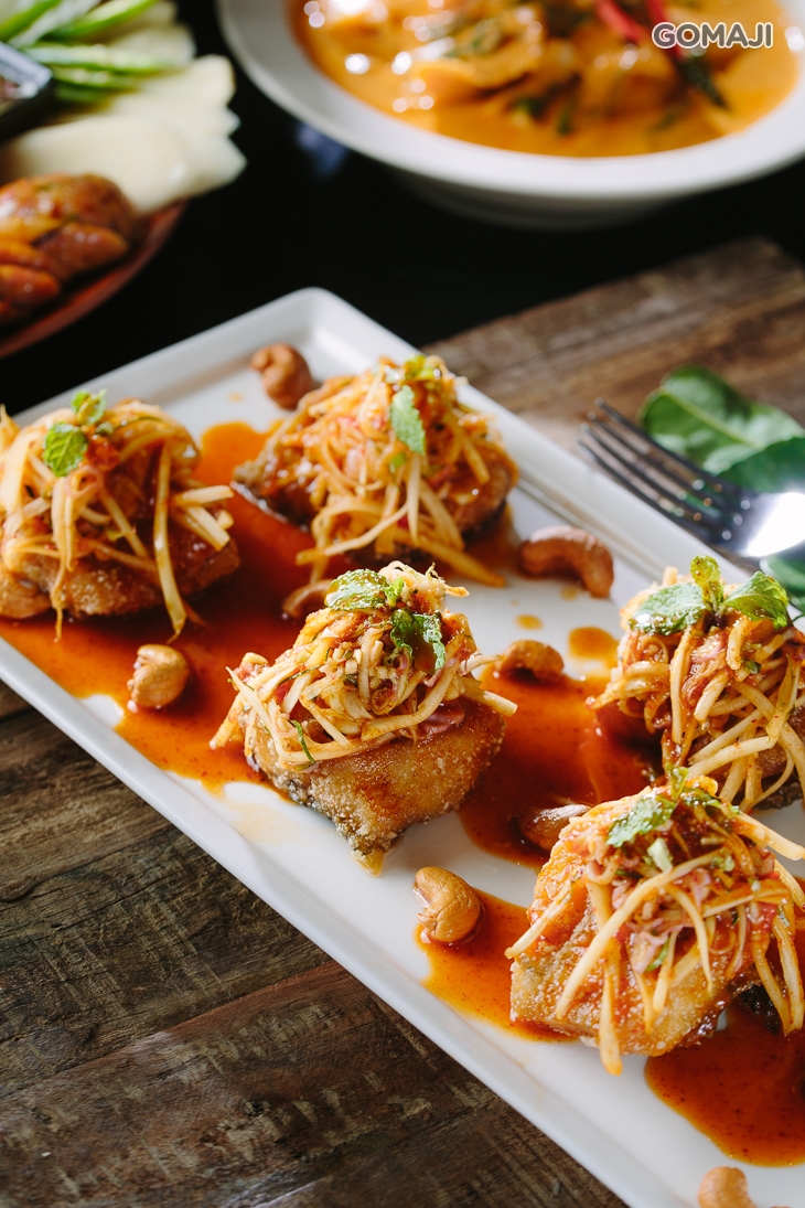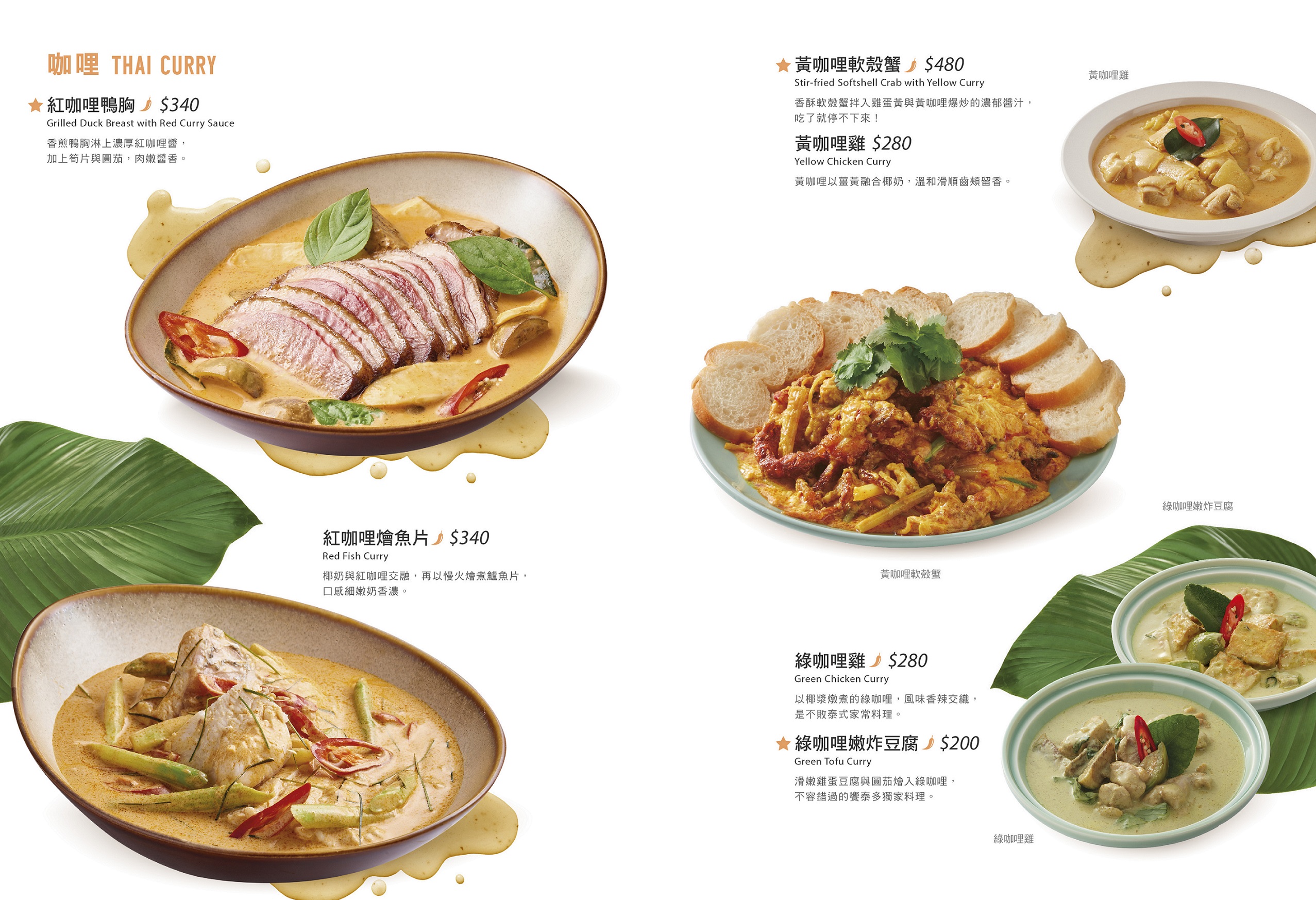 綠咖哩是以新鮮綠辣椒、香茅與椰奶一起熬煮,加上泰國進口的小圓茄,味道清香而不死鹹,口味辛辣回甘,甜辣參半,是最道地的泰式傳統風味。搭配嫩炸豆腐,吸附醬汁,味道濃郁,饗泰多獨一無二的料理搭配,絕對值得細細品味。