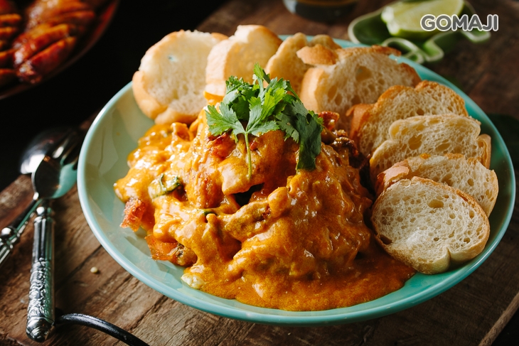 香酥軟殼蟹拌入雞蛋黃與黃咖哩爆炒的濃郁醬汁,加上麵包一起享用,令人停不住口的美味!
