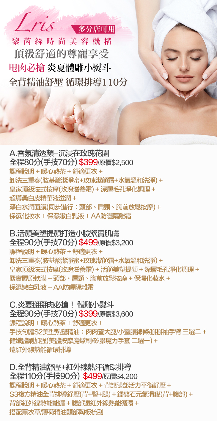 A.香氛清透顏-沉浸在玫瑰花園全程80分(⼿技70分) / B.活顏美塑提顏打造小臉緊實肌膚全程90分(⼿技70分) / C.炎夏掰掰肉必搶! 體雕小熨斗全程90分(⼿技70分) / D.全背精油舒壓+紅外線熱汗循環排導全程110分(⼿技90分)