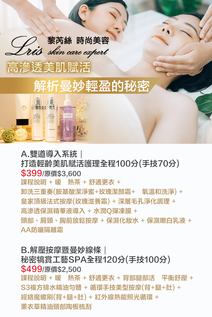 Lris黎芮絲時尚美容機構,專為崇尚美麗自然的女性設計課程,針對東方人膚質設計,以自然植物研發萃取的保養品為您護理,著重肌膚深層調理,尋回青春亮彩的極致美肌,滿足您對美麗的堅持!