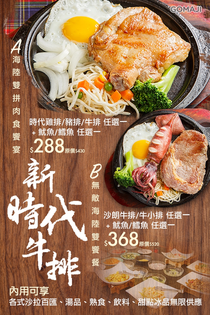 午、晚餐想來點不一樣的嗎?試試GOMAJI推薦的口袋美食New Style全新體驗 - 新時代牛排吧!位於桃園市中壢區民族路上的【新時代牛排】,餐點提供以平價實惠的牛排料理為主,除了必嚐無疑的牛排,還有雞排、豬排、鱈魚等主餐可以選擇!食材嚴選新鮮、料理過程用心、品質把關講究!在牛排競爭激烈的市場,依舊保有自己的主力客群,光是這幾點,就能看出【新時代牛排】的努力!本次與GOMAJI聯合推出麻吉獨享超值優惠,還等什麼!請帶著您空空的胃及嘴,揪伴登門光臨大快朵頤一番吧!