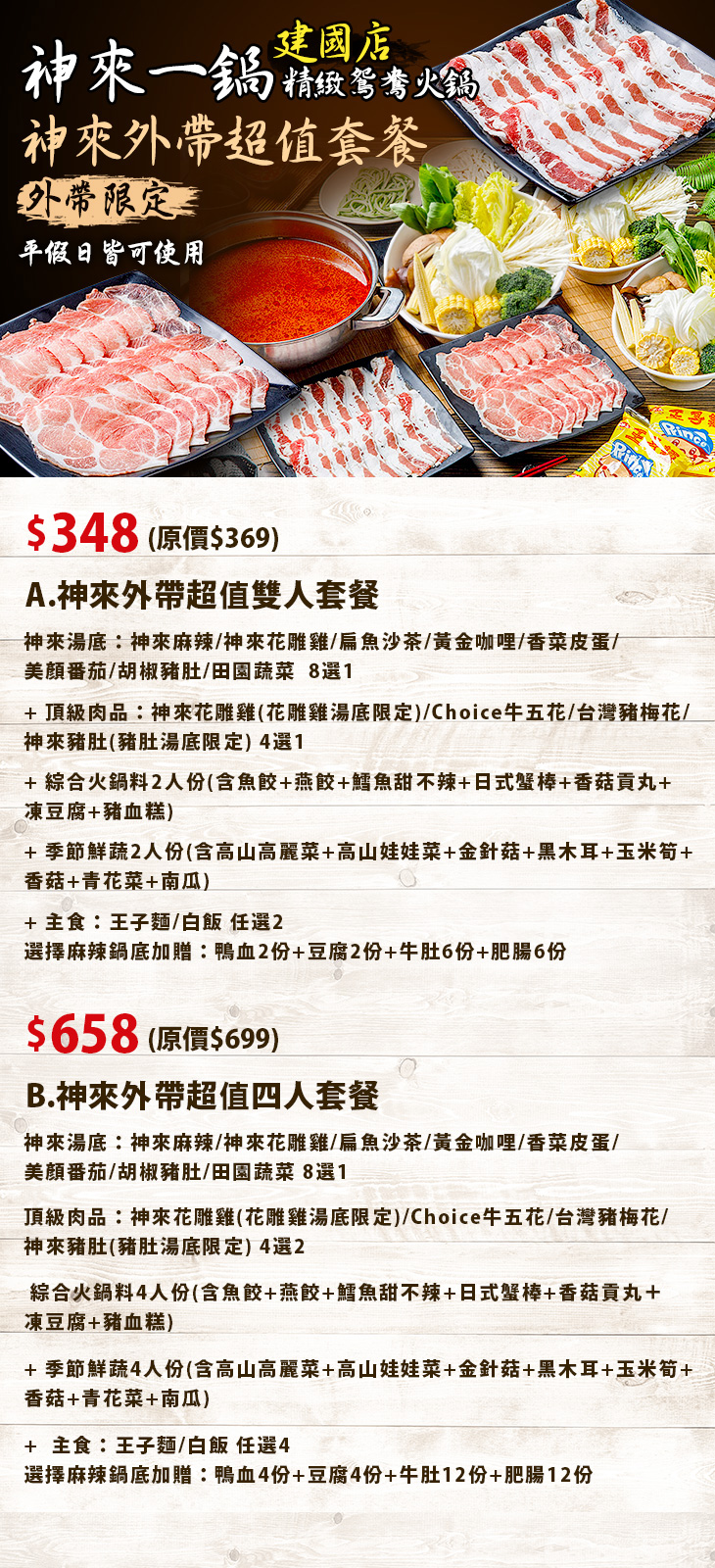 本店嚴選新鮮上好的食材,更每日悉心熬煮獨門湯頭,為您獻上一鍋又一鍋噴香迷人的美味!飢腸轆轆之時、結束一整天的忙碌之時、偶爾想來大快朵頤一番之時,趕緊把握這一波超值外帶優惠,買回家和家人好友們一同共享,品味的不只是精緻鍋物的迷人滋味,更是與珍視之人圍爐在一塊的醍醐味!保證讓您吃得盡興飽足、滿意過癮!
