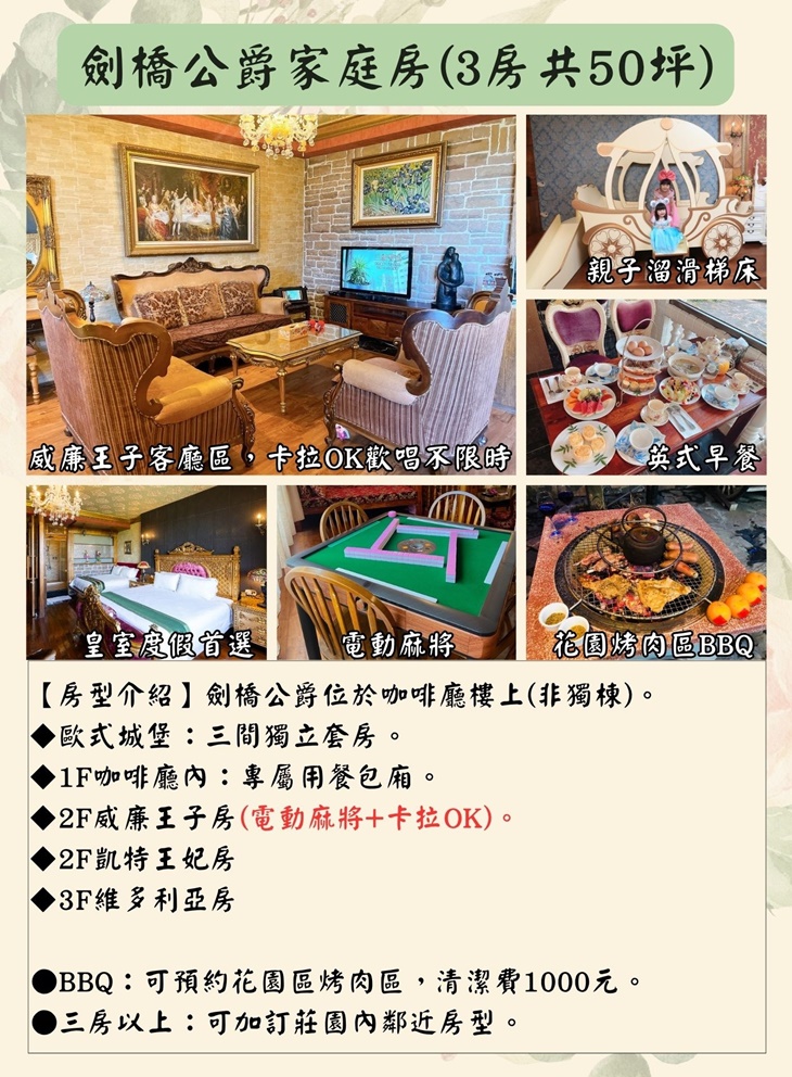 ★ 單筆購買三張兌換券可升等劍橋公爵家庭房(三房,含卡拉OK及麻將設施)