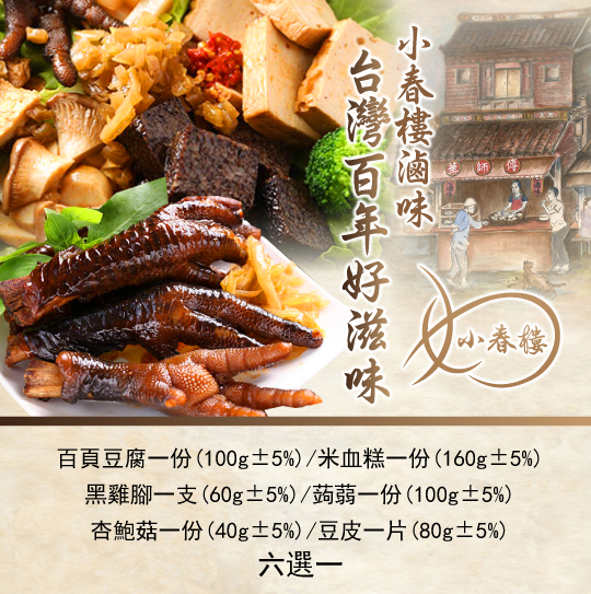 位於南京西路上、近捷運中山站6號出口,由第一代創始人-葉朝銓師傅傳承百年至今的小春樓,傳承百年、渾然天成道地香氣,使用十多種香料獨門配方,精心調配的百年滷汁與特調醬料,與嚴選的新鮮食材相輔相成,私房特製醬汁入味過癮,滋養出深邃香氣,絕不添加防腐劑,多樣化的經典滷味完美呈現出懷舊好滋味,多年來廣受電視媒體及書報雜誌採訪報導,並獲政府推薦肯定、指定參展。除了擄獲內行饕客的味蕾,更是觀光旅客的最佳伴手禮。