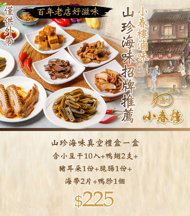 位於南京西路上、近捷運中山站6號出口,由第一代創始人-葉朝銓師傅傳承百年至今的小春樓,傳承百年、渾然天成道地香氣,使用十多種香料獨門配方,精心調配的百年滷汁與特調醬料,與嚴選的新鮮食材相輔相成,私房特製醬汁入味過癮,滋養出深邃香氣,絕不添加防腐劑,多樣化的經典滷味完美呈現出懷舊好滋味,多年來廣受電視媒體及書報雜誌採訪報導,並獲政府推薦肯定、指定參展。除了擄獲內行饕客的味蕾,更是觀光旅客的最佳伴手禮。