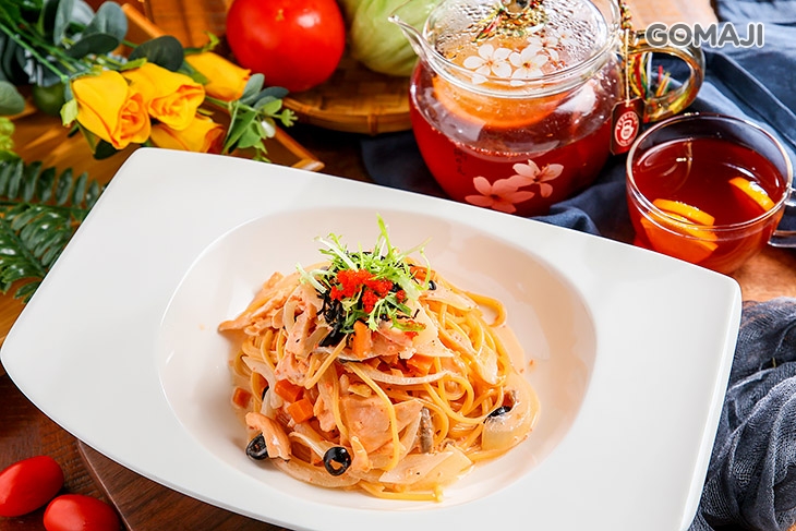 將滾水汆燙起鍋的義大利麵條,加入頂級明太子及新鮮鮭魚烹飪調味獻上,橘紅鮮艷的色澤,散發鮮香濃郁的迷人氣息!入口麵條彈牙,鮭魚肉質細緻甘甜,與明太子相襯,完美無比!熱愛異國料理的您,這道必嚐無疑!