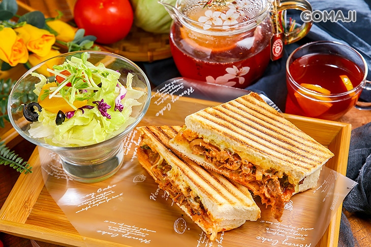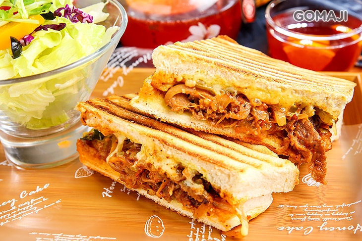 現烤出爐的牛肉帕尼尼三明治,吐司表皮一橫一橫凹凸規律的熱壓痕跡,散發淡淡焦香氣,搭配牛肉與起司等精選食材製作而成的美味餡料,營養、美味!起司牽絲口感讓人深深著迷!每一口都堪稱經典!