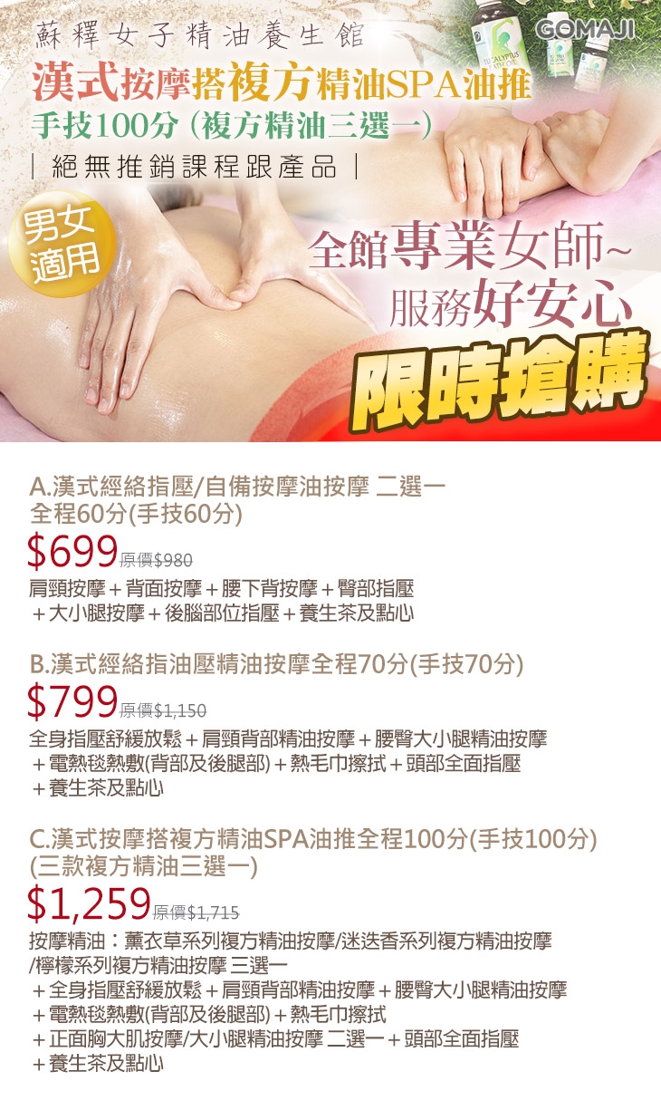 C.漢式按摩搭複方精油SPA油推全程100分(手技100分)(三款複方精油三選一)