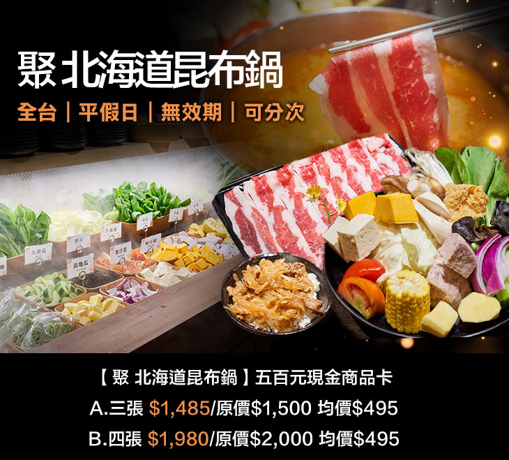 ➤台北南京東店、中壢SOGO店為【聚 北海道昆布鍋】新型態概念店!套餐均可無限享用新鮮野菜、日式飯麵副食、霜淇淋、甜點與冷熱飲品!物超所值,還不快手刀下單!