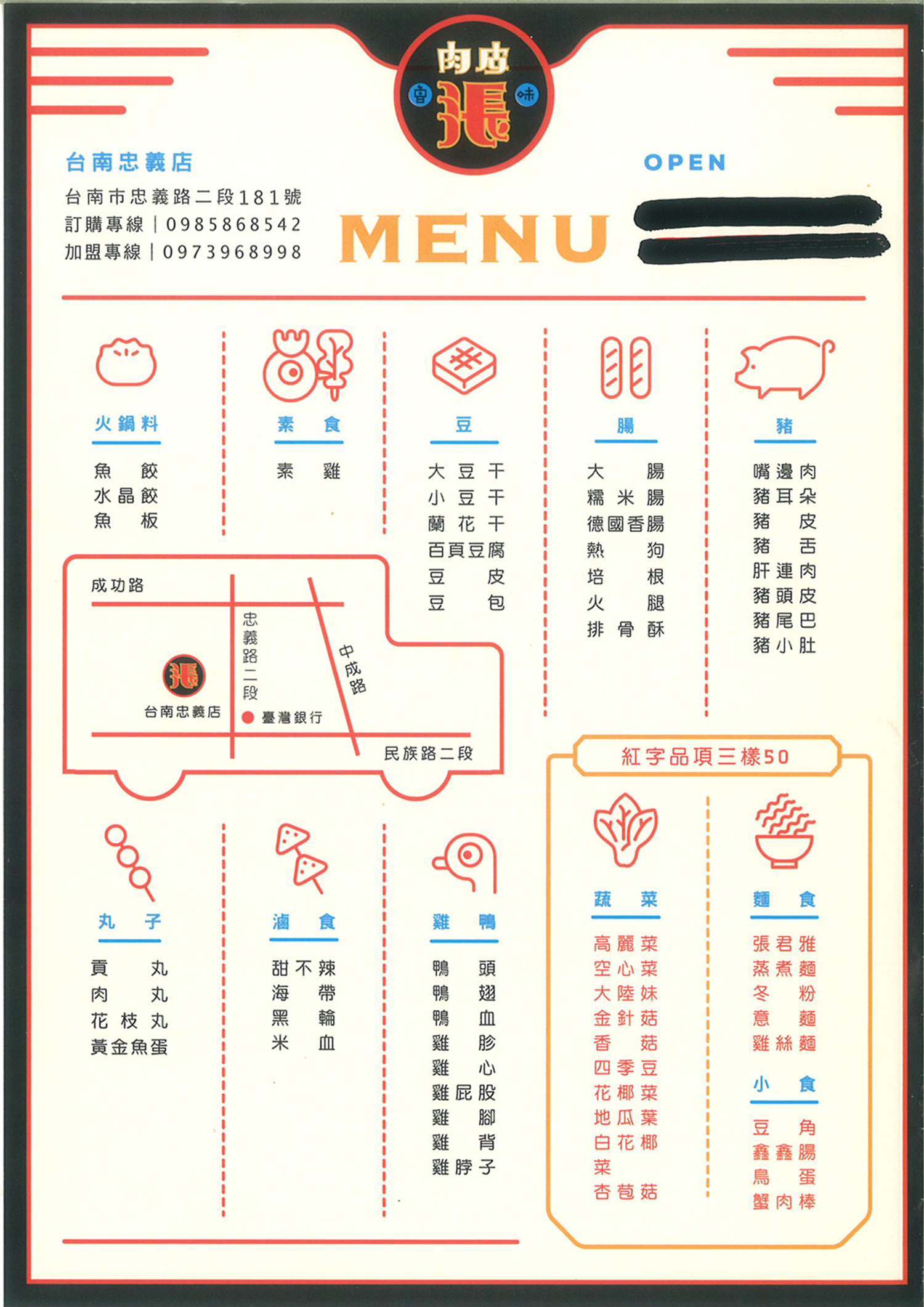 特別推薦:豬小肚、肝連肉、嘴邊肉、黃金魚蛋、鴨翅、鴨血、雞屁股、蔬菜類、麵食類、火鍋類等