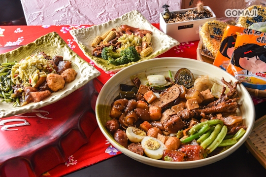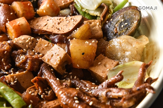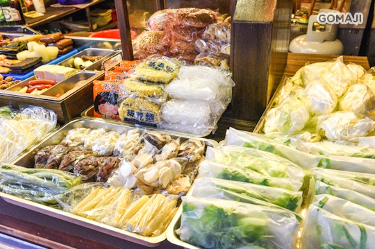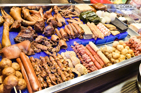 香腸、雞蛋、蟹肉棒、排骨酥、大豆干、海帶、皮蛋、水晶餃、雞腳、四季豆、菜頭