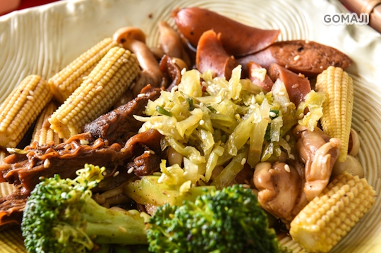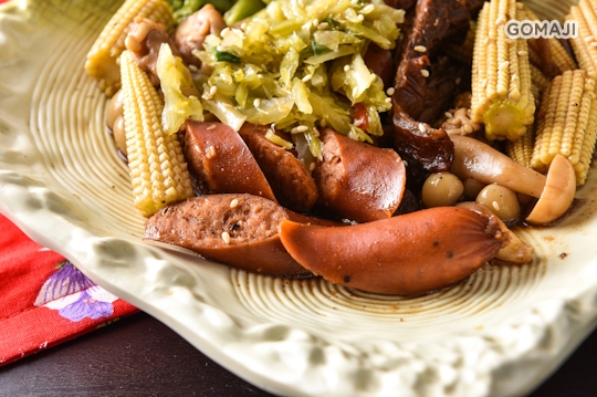 肝連肉、德國香腸、鴻喜菇、花椰菜、自製的配料-酸菜