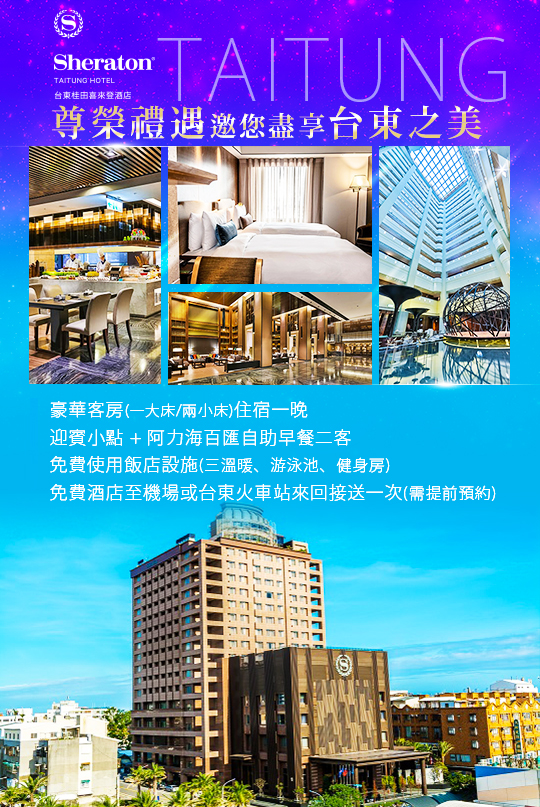 友情、熱情與純樸的台東,沒有城市高樓閃爍的霓虹,暮黑的夜空向來只有微亮的星斗襯景相伴,子夜的寧靜、泥土的香氣與間歇的蟲鳴,交織著後山淡雅的閒適生活。就在如此質樸且詩意盎然的老台東市區,群屋盛瓦中鶴立著台東之星,全台第三間且更是東台灣第一家國際級喜來登酒店!