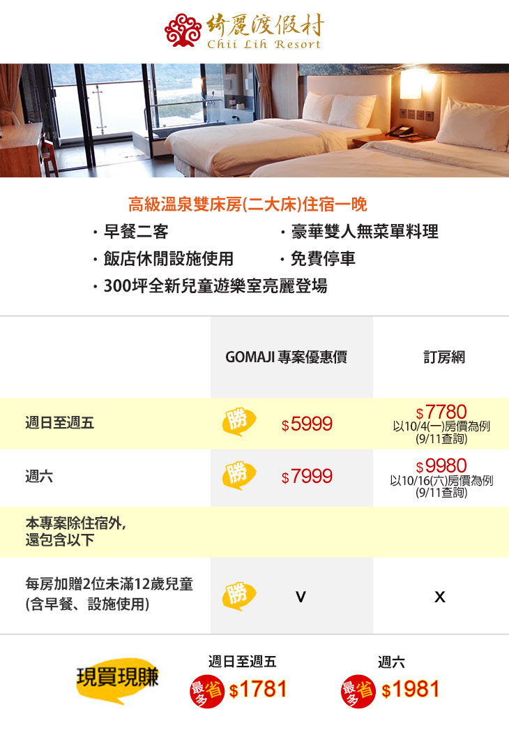 ★ 雙人一泊二食限量升等高級溫泉雙床房(房內附泡湯池),享豪華雙人無菜單料理,每房加贈2位未滿12歲兒童入住(含早餐、設施使用)!