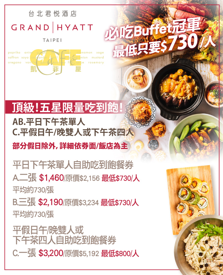 頂級!五星限量吃到飽!AB.平日下午茶單人自助吃到飽餐券/C.平假日午/晚雙人或下午茶四人自助吃到飽餐券(部分除外),詳情以券面/飯店為主)