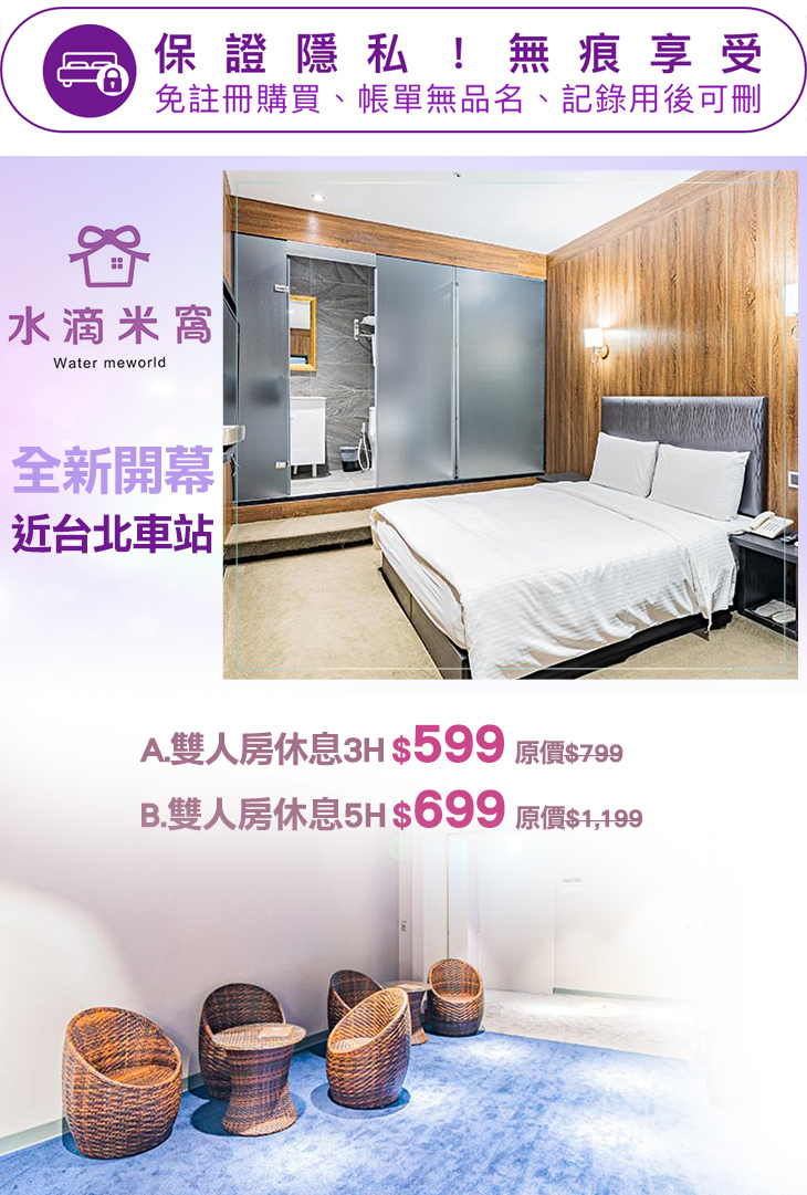 鄰近於交通便捷、美食無數的台北車站,您可在逛街、遊玩之後到此稍作休憩、補充能量,為下一趟旅程預作準備。「台北水滴米窩」致力於提供優質服務與良好設備,一踏入接待廳堂就會有專業的工作人員引導辦理各項事宜,既貼心又有耐心,若有其他需求也會不吝回應、給予建議,是近來頗受各方人士青睞的旅宿地點,保證讓您心滿意足、不虛此行!