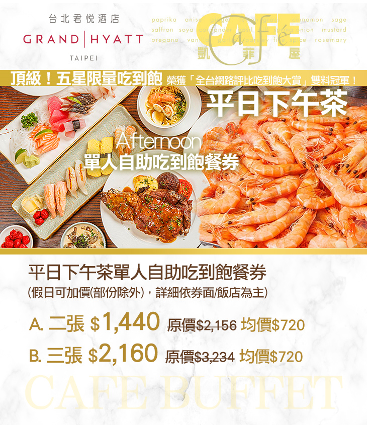 2015年風光完成改裝的台北君悅酒店凱菲屋,不僅是現今五星級飯店自助餐廳霸主,連年在網路評比奪下「飯店人氣王」與「最佳人氣美食王」等雙料冠軍肯定。