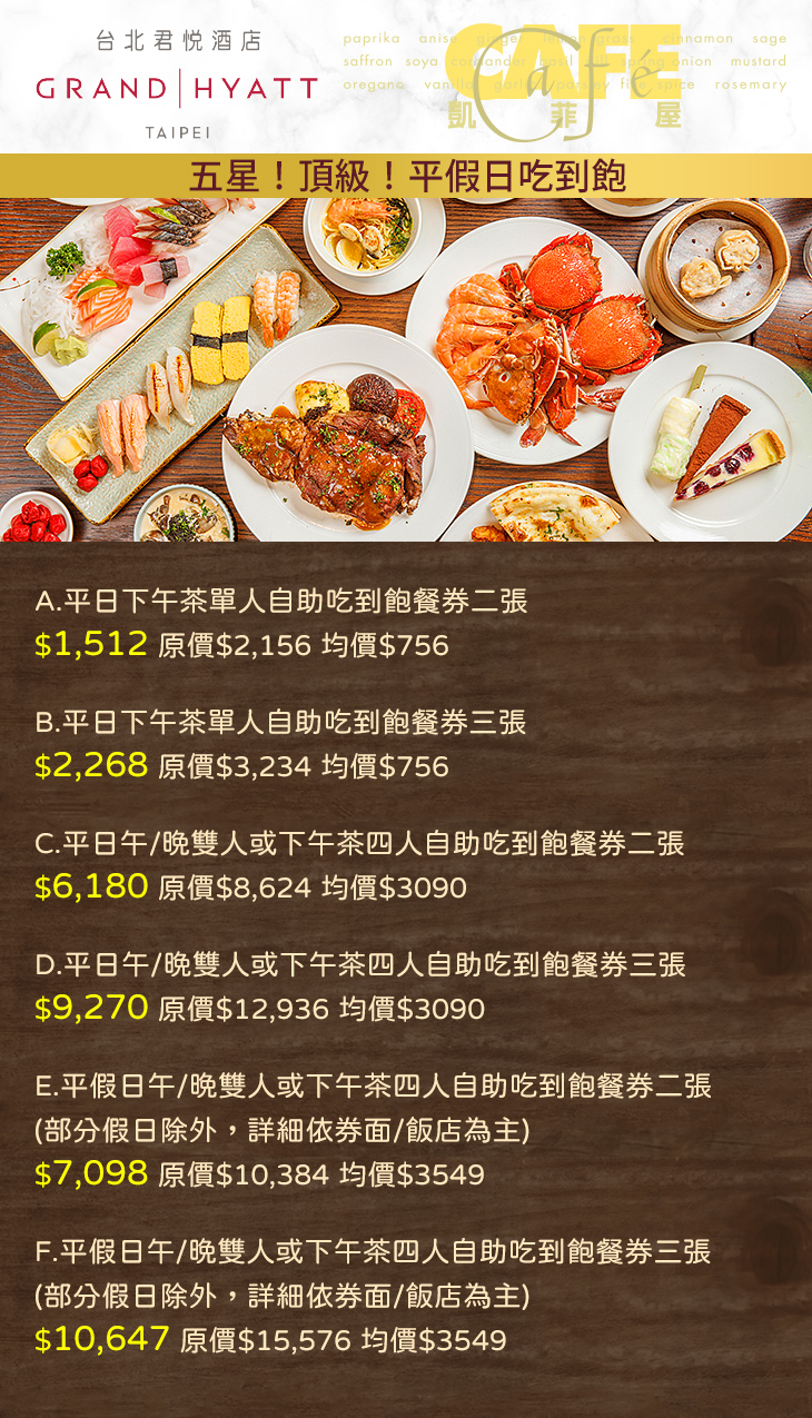 F.平假日午/晚雙人或下午茶四人自助吃到飽餐券三張(部分假日除外,詳細依券面/飯店為主)