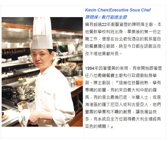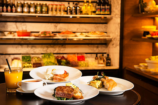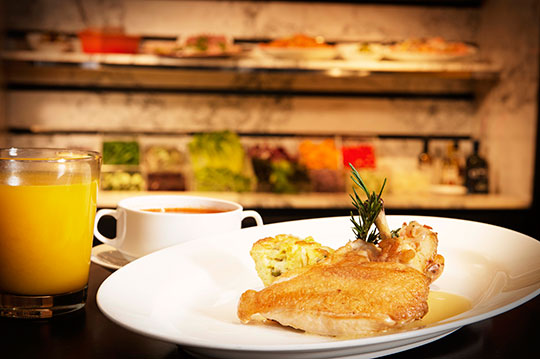 菜色含多樣蔬食及海鮮沙拉吧、湯品、主菜可選「精緻美國牛小排」或「水煮鮭魚菲力」或「油封鴨腿」(主菜將不定期依照市場季節時價而調整同價值之菜色供應)、甜點百匯、時令鮮果及晨間鮮烘麵包。