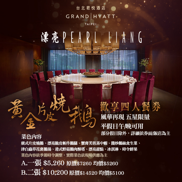 廣東粵菜香飄揚,肉嫩燒鵝在漂亮。風華再現!五星限量!平假日午/晚-黃金片皮燒鵝歡享四人餐券(部分假日除外,詳細依券面/飯店為主)