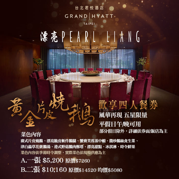 ❖廣東粵菜香飄揚,肉嫩燒鵝在漂亮。風華再現!五星限量!平假日午/晚-黃金片皮燒鵝歡享四人餐券 (部分假日除外,詳細依券面/飯店為主)