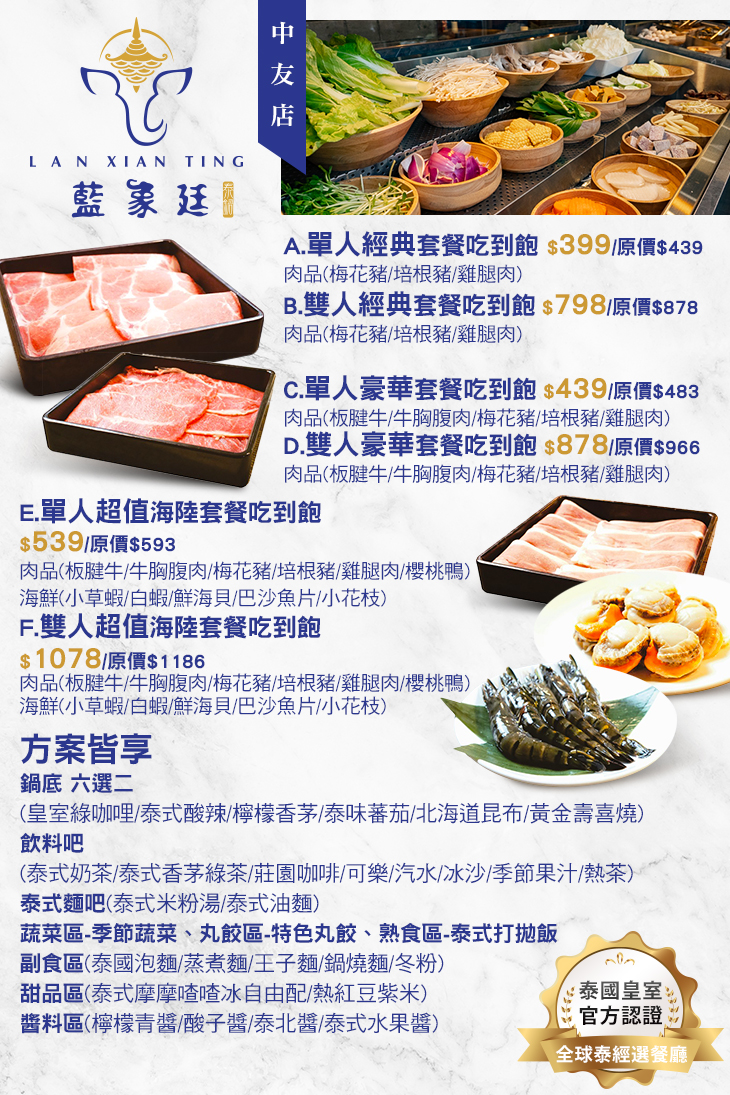 A.單人(平日午餐/午茶)經典套餐吃到飽 / B.雙人(平日午餐/午茶)經典套餐吃到飽 / C.單人(平日午餐/午茶)豪華套餐吃到飽 / D.雙人(平日午餐/午茶)豪華套餐吃到飽 / E.單人(平日午餐/午茶)超值海陸套餐吃到飽 / F.雙人(平日午餐/午茶)超值海陸套餐吃到飽