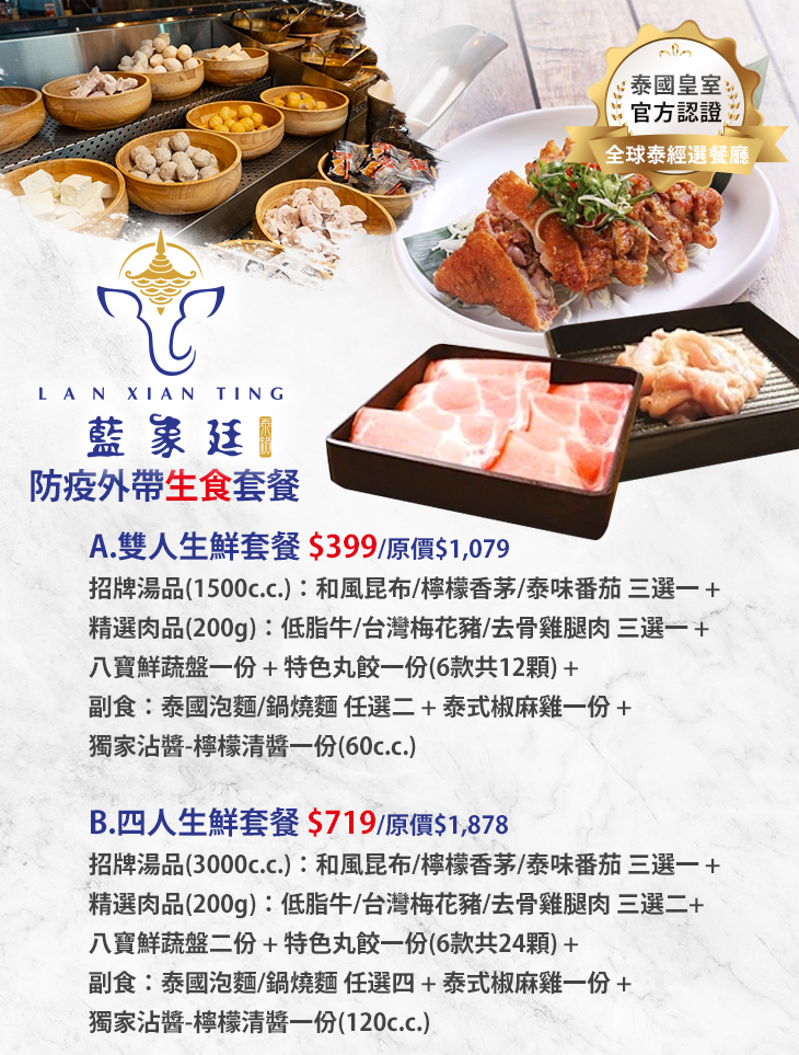 ▽ 坐在家中品味火鍋,才更有圍爐的雅致啊!風靡眾人的特色泰式火鍋-【藍象廷泰鍋】,特別推出優惠外帶方案!實惠的價位、真材實料的份量、不變的品質,讓您將店家招牌的泰式火鍋直接打包回家,在家也能輕鬆再現【藍象廷】的美味~