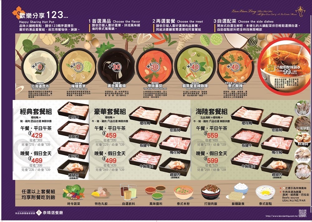 ★超值、優惠的泰式火鍋吃到飽套餐,各種鍋底、時蔬嫩肉都有,讓您大快朵頤、痛快享用飽足、異國的美味!