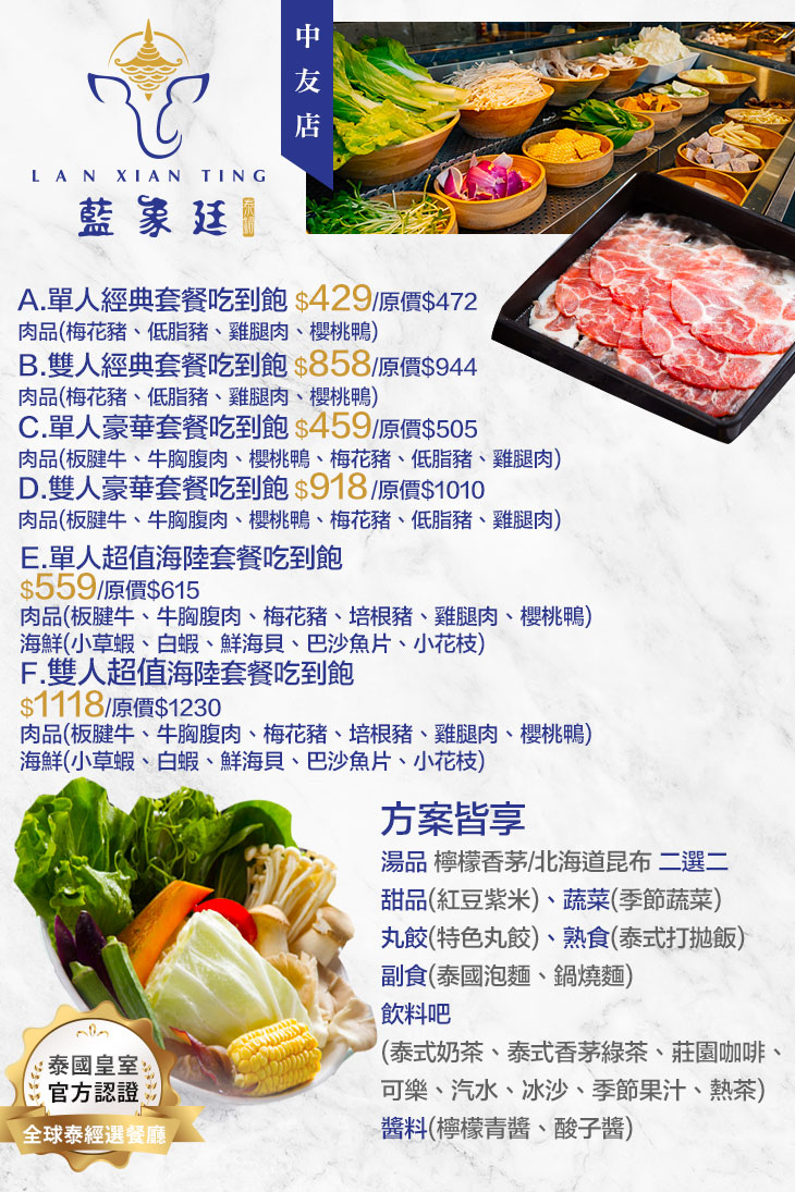 藍象廷以吃到飽的超值概念為用餐方式,以獨特泰國香料,如香茅、南薑、檸檬葉…等熬煮出四大特色湯底。另由專人推車服務,將數十樣豐富的鍋物食材送至座位方便顧客選取,強調食材鮮美原味,讓顧客在藍象廷能一次滿足泰國菜與泰式火鍋的雙重饗宴!.jpg)
