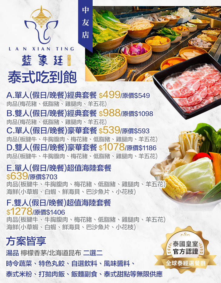 藍象廷以吃到飽的超值概念為用餐方式,以獨特泰國香料,如香茅、南薑、檸檬葉…等熬煮出四大特色湯底。另由專人推車服務,將數十樣豐富的鍋物食材送至座位方便顧客選取,強調食材鮮美原味,讓顧客在藍象廷能一次滿足泰國菜與泰式火鍋的雙重饗宴!.jpg)