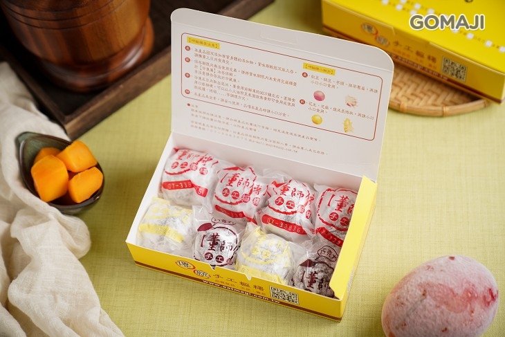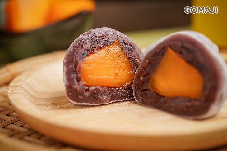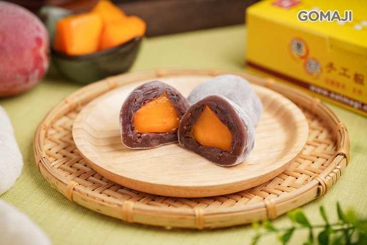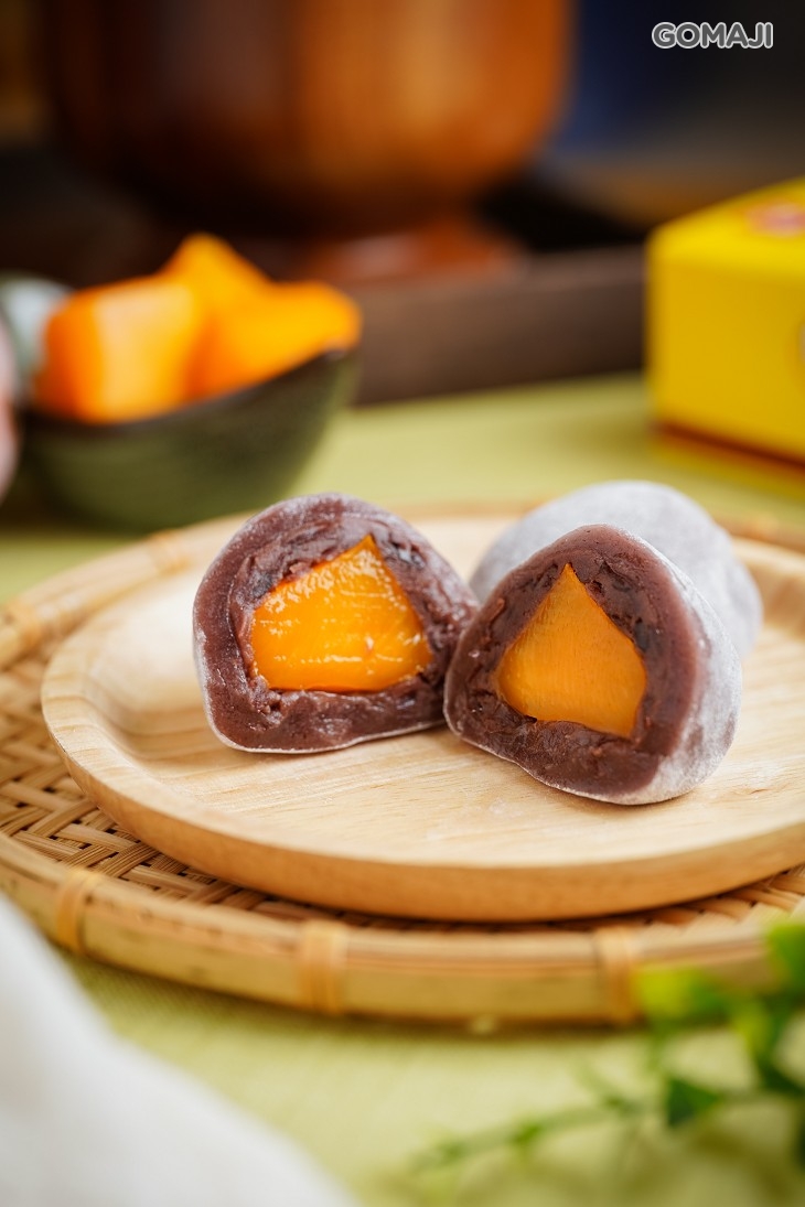 嚴選台灣在地出產的的上品芒果,切成大塊狀後,與綿密紅豆餡一同包入【董師傅】特別研發的紫米皮當中,渾圓紮實的模樣,咬下後便在口中爆發豐盈的果香,芒果極甜又稍帶酸味的風味十分爽口,與甜美的紅豆泥搭配在一塊,可說是甜而不膩,讓人回味無窮!相較於一般糯米皮更有彈性與咬勁的紫米皮,熱量較低,又富含豐富的營養,讓您品嚐起來輕盈無負擔,不被體重、健康等困擾受限,開心享用麻糬香Q料多的美好!