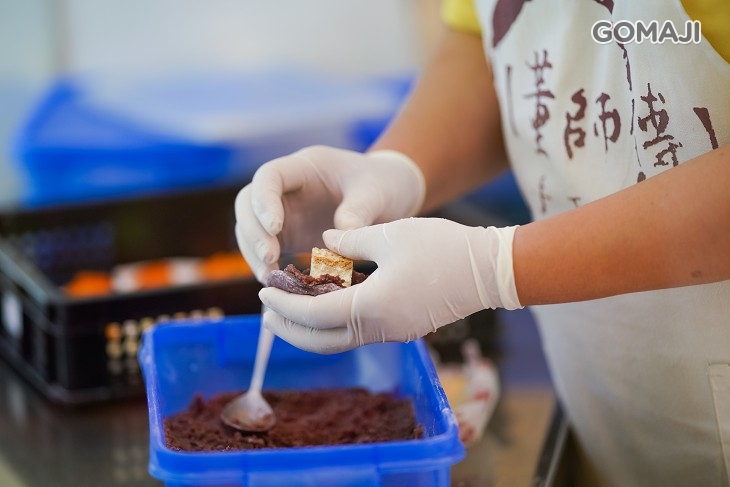 為了品質,老闆選用台產糯米,靠著老道經驗抓出老米、新米的比例,泡水3至4小時,再磨成糯米漿,經過擠壓脫水後,再以蒸籠蒸熟,放涼後就是口感軟綿,味道香Q的糯米麻糬皮了!從大灶燒柴、糯米漿炊熟、揉擀糯米筋、製作內餡,最後將一個個麻糬,像陶藝作品般鋪陳在籐篩子裡供客人選購。數十多年來董師傅對於麻糬的用心,用情之深,無人可比。
