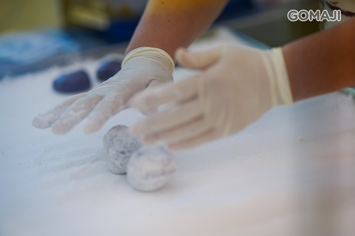 董師傅的衛生控管,一向都是十分嚴格,工作人員會戴上帽子、口罩及手套,從麻糬外皮到內餡,每顆麻糬都是耐心手工製作,絕不添加防腐劑!