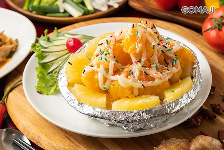 彈牙紮實的鮮蝦仁,裹上麵衣油炸至金黃香酥,淋上滿滿的美乃滋後佐入鳳梨調味,並灑上些許色彩繽紛的巧克力米,這道專屬於台式熱炒的經典佳餚,便可以上菜啦!薄酥爽脆的外皮一咬下去,裡頭是飽滿多汁的鮮甜蝦仁,酸酸甜甜的調味,讓整體不油不膩、清爽可口!風味獨到的鳳梨蝦球,可是征服了許多小朋友的味蕾呢!