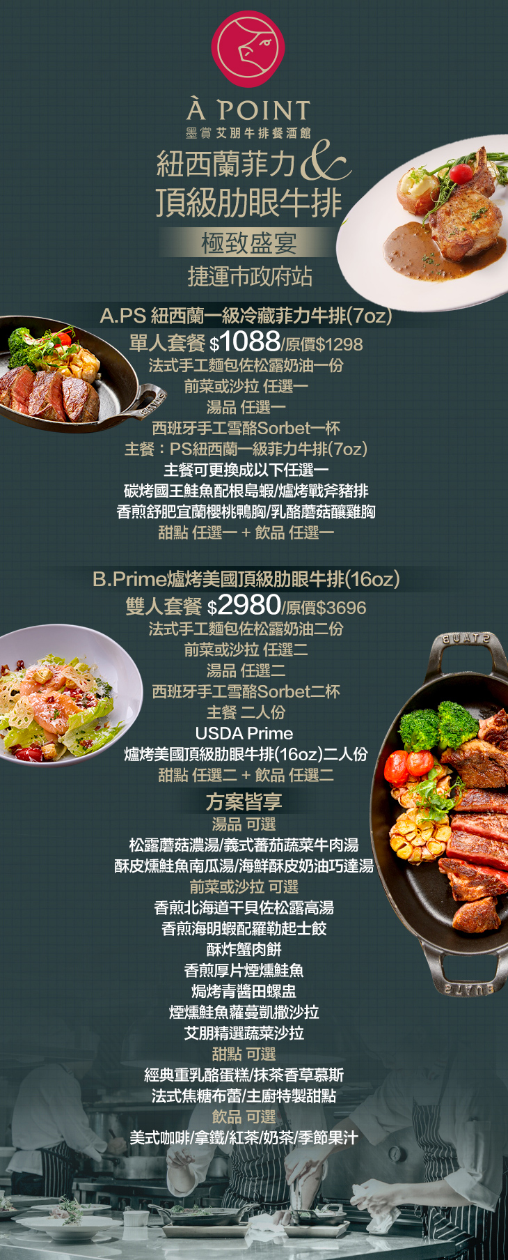 A.PS 紐西蘭一級冷藏菲力牛排(7oz)套餐 / B.Prime爐烤美國頂級肋眼牛排(16oz)雙人套餐