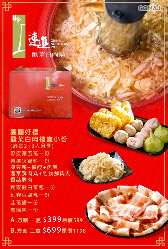 ■ 內容物: 帶皮五花肉,青醬包,凍豆腐,蛋餃,魚餃,泡菜鮮肉丸,竹炭鮮肉丸,香菇鮮肉丸,高湯包,酸菜,酸菜原汁,紅麴豆腐乳,韮花醬,青花椒油(不辣)