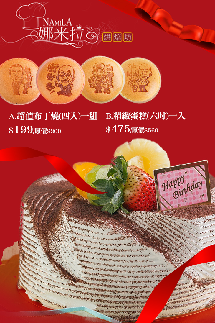 生日蛋糕是代表心中最深的祝福,由娜米拉為您用心製作視覺與味覺兼具的精緻蛋糕,送給身邊最重要的他/她吧!堅持選用最優質的原物料,蛋糕體札實鬆綿、奶油不甜不膩,再配上鮮甜的水果或餅乾,呈現令人感動的每一個時刻!